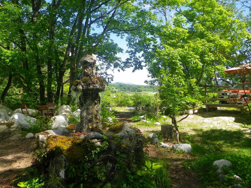 カフェが立っているのは中房川の畔の林間。アカマツやナラが茂る森を切り開いて作った、野趣あふれるガーデンが出迎えてくれます。石のエントランスを抜けると、木々の合間に見え隠れするハンドメイドのオブジェや石の噴水、ベンチなどが点在し、まるで森の中の小さな公園といった雰囲気。オープンエア席に心惹かれつつ、まずはドアを開けて店内へ。