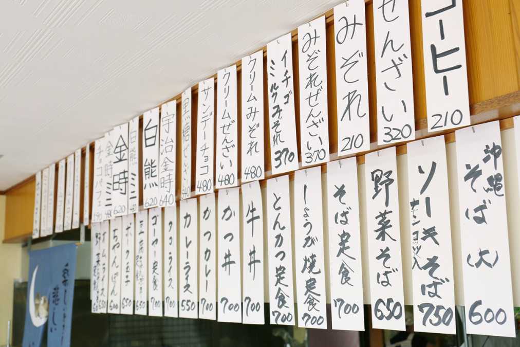 沖縄そばや牛丼、豆腐ちゃんぷるー定食、しょうが焼定食、タコライスなどの食事メニューに加え、チョコパフェや宇治金時、ぜんざい(沖縄のぜんざいは、お汁粉タイプではなくかき氷スタイル)など、甘味も豊富に揃っています。