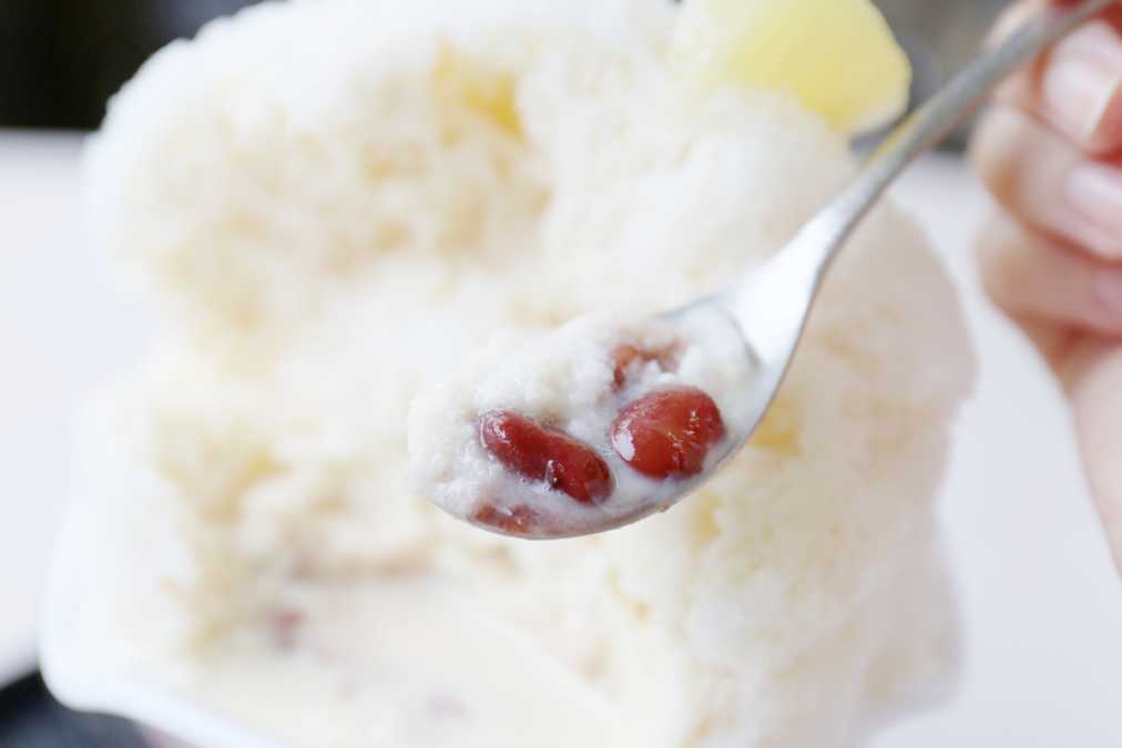 ボリュームたっぷりの白熊は、高さ25cmほど。小サイズもありますが、せっかくなので大サイズにトライしてみてください。ふわふわな氷には練乳がたっぷり。氷の山をサクサク崩しながら食べ進んでいくと、下には自家製の金時豆と白玉が隠れています。