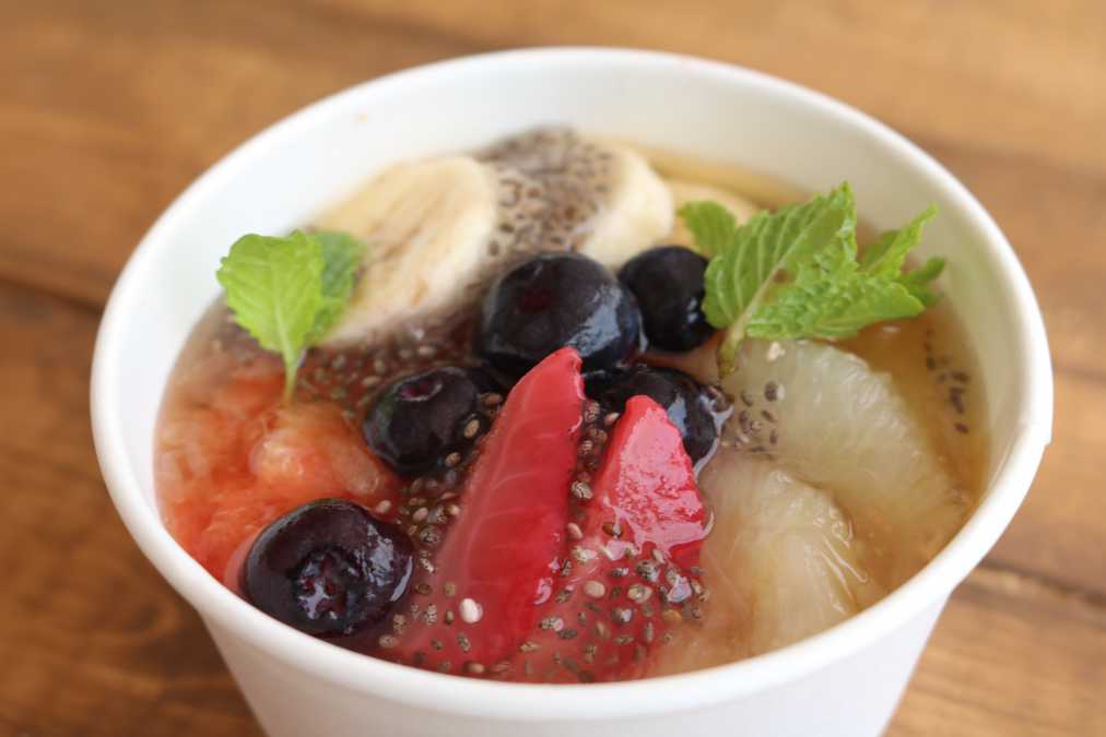 はちみつ漬けした2種類のグレープフルーツと、ブルーベリー、バナナにチアシードをトッピング。アッサムティーのジュレも入っていて、さわやかな甘さが、暑さに疲れた身体を癒してくれます。