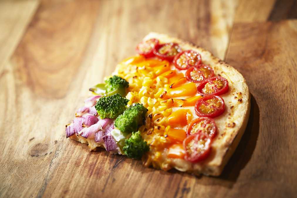 トマトやパプリカ、コーンに紫タマネギで7色のレインボーを再現したピザは、夏の暑い日差しの下、ビーチで食べるのにぴったり。