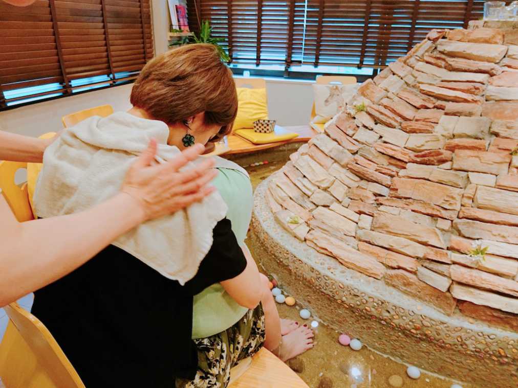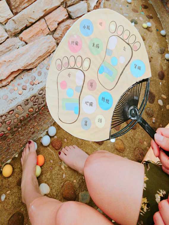 床には足つぼを刺激する石が敷かれ、つぼ押し用のゴルフボールも転がっています。足つぼの反射区が描かれたうちわを見ながら足裏を刺激。冷え性に効果的なつぼは足裏の真ん中とのことで重点的にぐいぐい押してみたら、これが痛気持ちよくてクセになりそう!