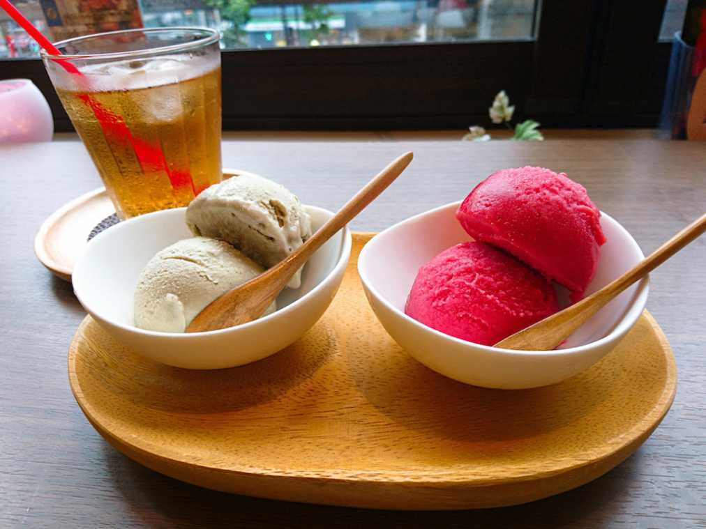 足湯に浸かりながら食べられるフードメニューもあります。夏におすすめなのは「オーガニックイタリアンジェラート」(各種450円)。足湯でちょっと暑くなったなと感じたら冷たいデザートでクールダウン。