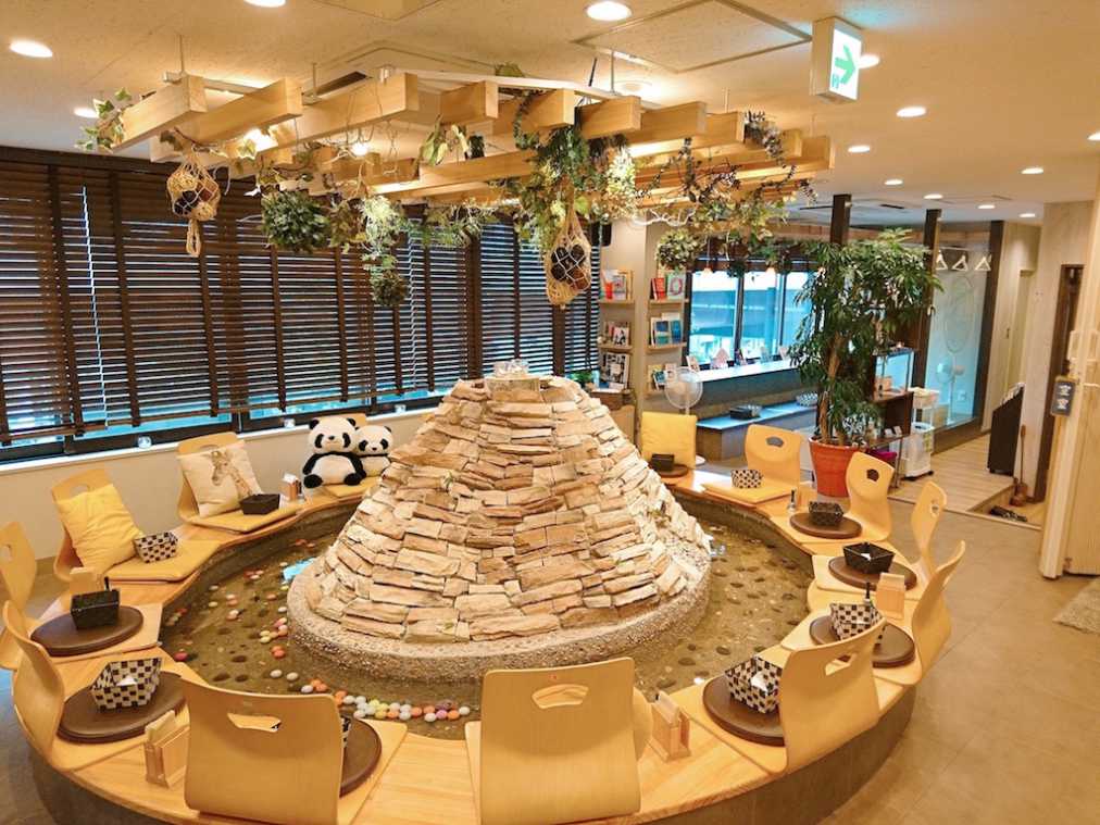 夏の冷え対策を気軽にできるカフェがあると聞き、訪れたのは御徒町にある「HOGUREST」。店内に入ると中央に大きな岩山と円形の足湯スペースがありました。