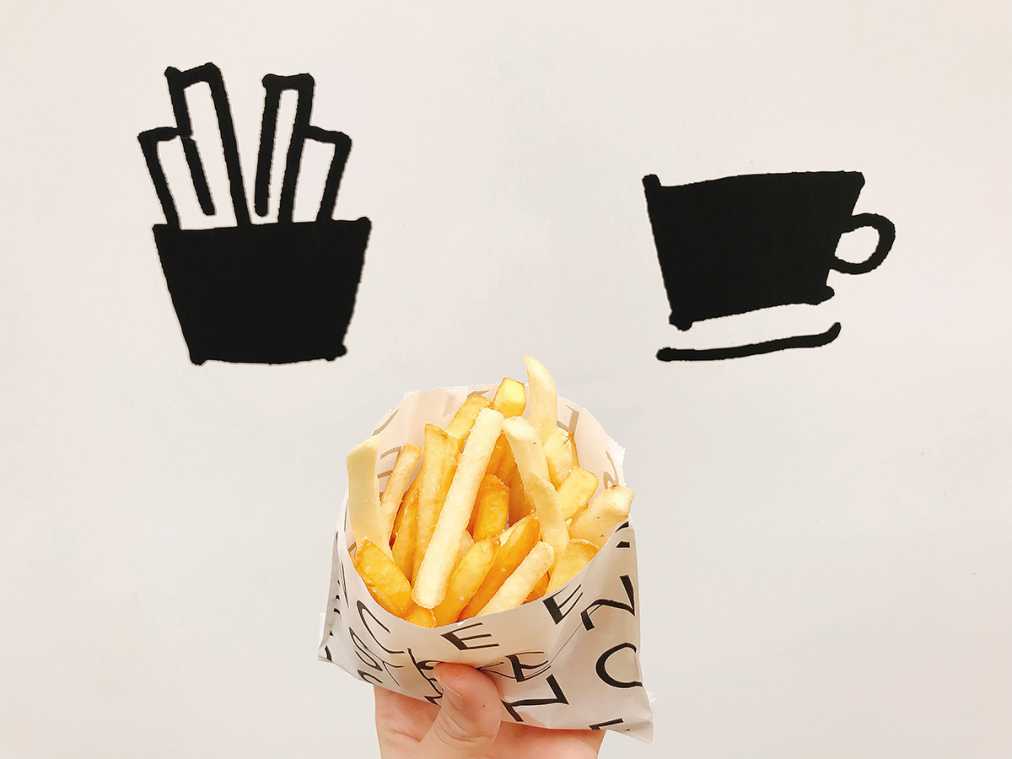 白いスタンドタイプのお店は、スタイリッシュでありながら女子心をくすぐるポイントもしっかり押さえた造り。壁にはフレンチフライや紅茶のカップが描かれていて、人気のフォトスポットになっています。フレンチフライを片手にパシャりとスマホをかざせば、写真映えする1枚が撮れるはず!