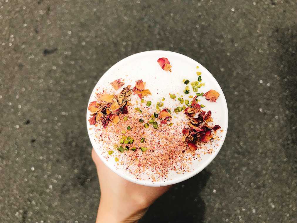 フレンチフライと並んで看板メニューになっているのが紅茶。紅茶大国として知られるスリランカのムレスナ社製の茶葉を使用したフレーバーティーが味わえます。細かく砕いたバラの花びらとピスタチオを浮かべたオリジナルの「ローズティーラテ」はキュートすぎて飲んでしまうのがもったいないほど!