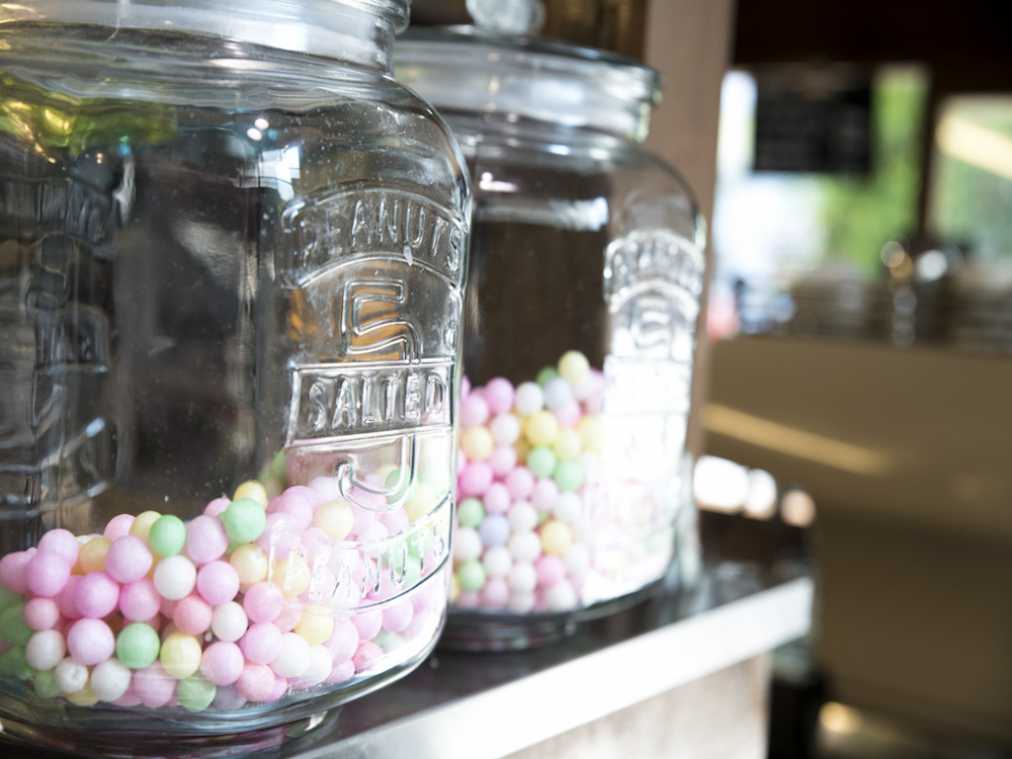 店内すぐ右手のカウンターには2つの瓶が置いてあり、カラフルなおいりが詰められています。乙女心をくすぐるビジュアルに、おいりドリンクへの期待が高まります!この時は、おいりが少し減っていましたが、タイミングが良ければ瓶いっぱいのおいりが見られるそうですよ。