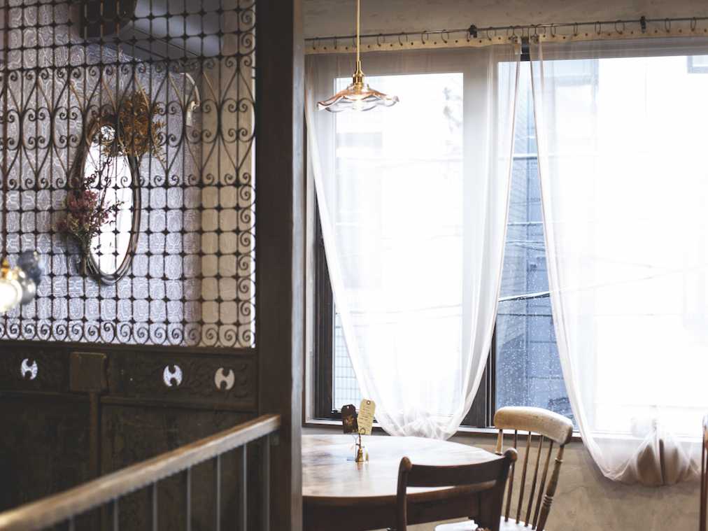 2階のテーブル席に案内してもらうと、そこは海外の古い一軒家に遊びに来たような世界観!アンティークの小物や家具、壁紙など、模様替えのお手本にしたくなります。NYの倉庫のシャッターをパーテーションに使うといった、上級テクニック満載のインテリアにも注目です。