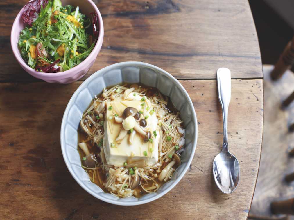 老舗のお豆腐のまろやかさとコクの深さに触れたいなら、ランチの「豆腐ライスボウル」(1080円)がおすすめ。ご飯の上に贅沢なお豆腐がのったひと品。しっかりと出汁のきいた餡をからめていただくご飯とお豆腐は、お疲れ気味の胃に染みわたるバツグンのおしさ。ピリッと辛い生姜のアクセントも効いています。
