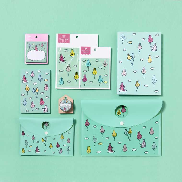 気になる柄は、風船や雲に変身することが得意な人気キャラクター・うさぎの「うさぶーちゃん」をはじめ、おどけた表情がキュートな「おーいくまちゃん」など、全部で8種類。同じ柄のノートや付箋なども展開しているので、揃えて使えば可愛さ最強!