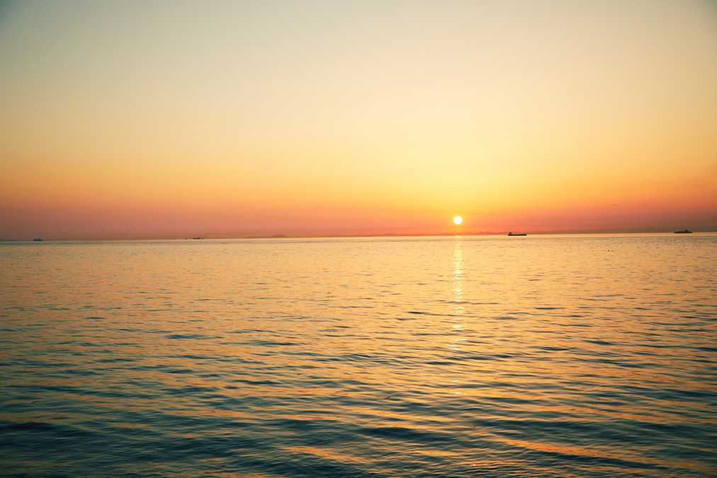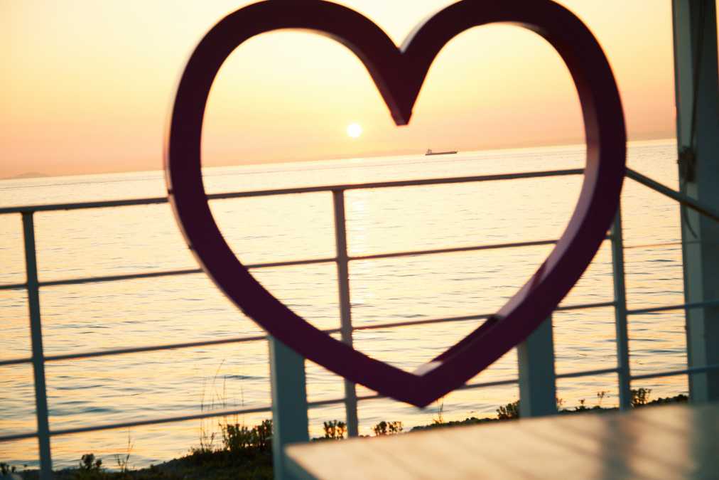 「日本の夕陽100選」に選ばれた淡路島の海と夕日が望めるウッドデッキは、夕方になると多くの人で賑わいます。ハートのモチーフ越しに見る夕日はそれだけでフォトジェニック!