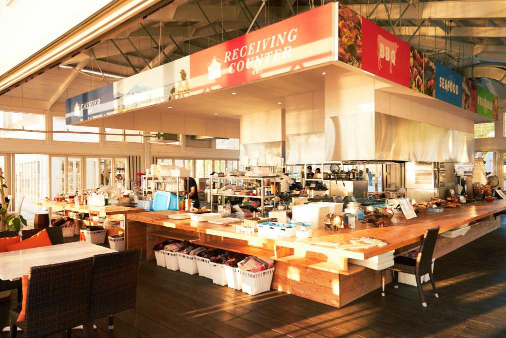 「クラフトサーカス」のいちばんの自慢は、コバルトブルーの海を目前に望む、開放感あふれるウッドデッキ。ルーフ付きで雨の日も安心の、240席のテラス席を備えています。