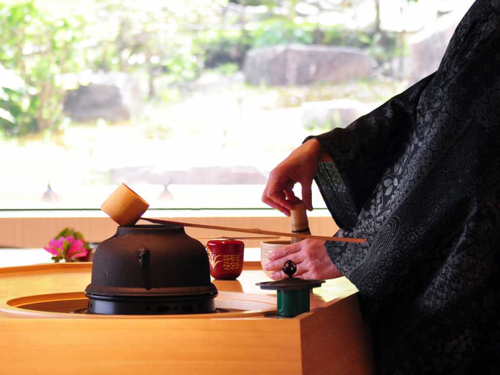 桜島に見立てた茶釜があり、ここで点てたお抹茶をいただけるんです。