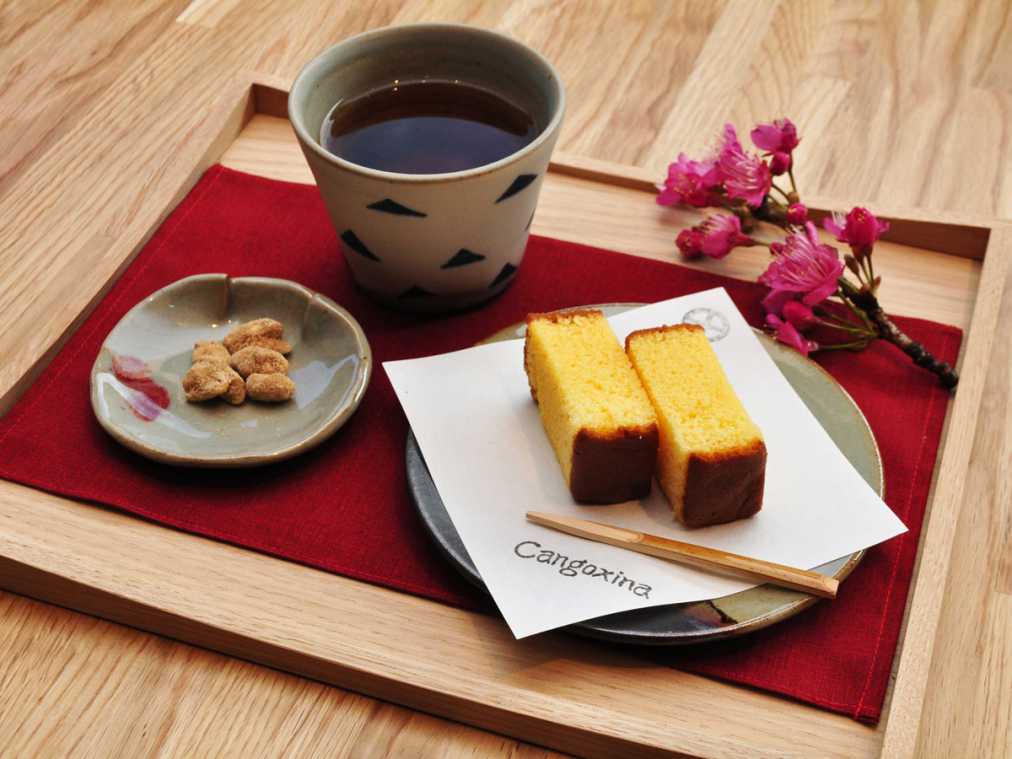 加壽天以羅(カステラ)450円もおすすめです。島津家の家紋と「cangoxina」の印字がされた蒲生和紙敷紙もオシャレです。ちなみに敷紙は記念に持ち帰ってOKだそうですよ。