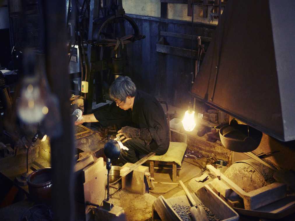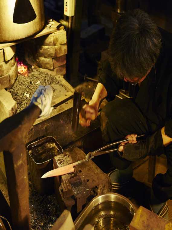 炭は、岩手県から取り寄せる松炭。「松炭は軽くて、火力がいいんです」と言葉少なに語りながら、左手に鋼を、右手にかなづちを、左足はフイゴでかまどに風を送って作業を進めていきます。その姿は、まさに全身全霊で鉄に気持ちを込めているよう。