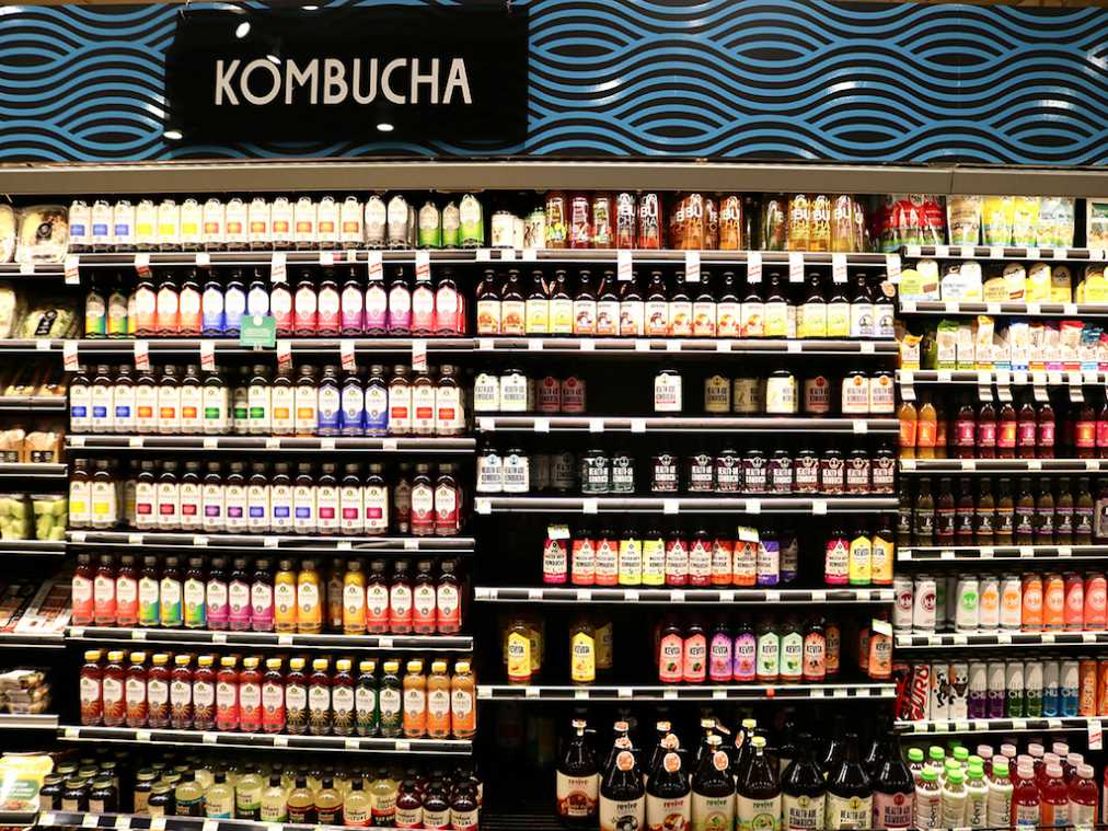 「KOMBUCHA」の発祥は実はモンゴルで、70年代には日本で“紅茶キノコ”として一世を風びしました。近年は、セレブをきっかけにアメリカでも人気に火が付き写真のようにスーパーにコーナーがあるほどすっかりメジャーな存在に。