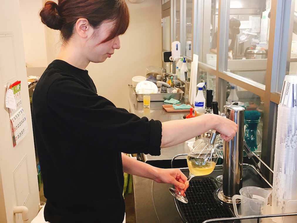 注文すると、まるでクラフトビールのようにサーバーからグラスの中に注がれるという斬新なスタイル。色鮮やかかつ、発酵によりシュワシュワと微発泡しているビジュアルは、まるでスパークリングワインみたい!