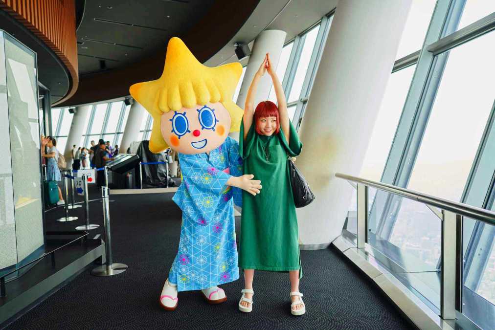 東京スカイツリーの公式キャラクター「ソラカラちゃん」とふれ合えるグリーティングも開催しています。夏限定の浴衣衣装に身を包んだソラカラちゃんの横でスカイツリーポーズ(勝手に命名)を取る私。