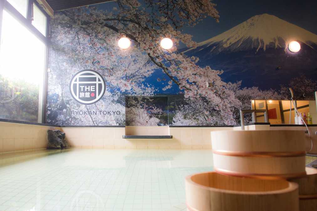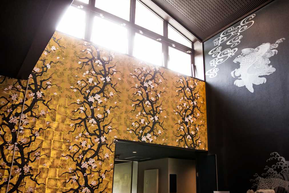 エントランスには巨大な赤い提灯が飾られ、金箔風の壁には桜、サイドの漆黒の壁には鯉が描かれています。外国人がクールジャパンと感じるような日本の様式美が表現されていて、非日常感たっぷり。