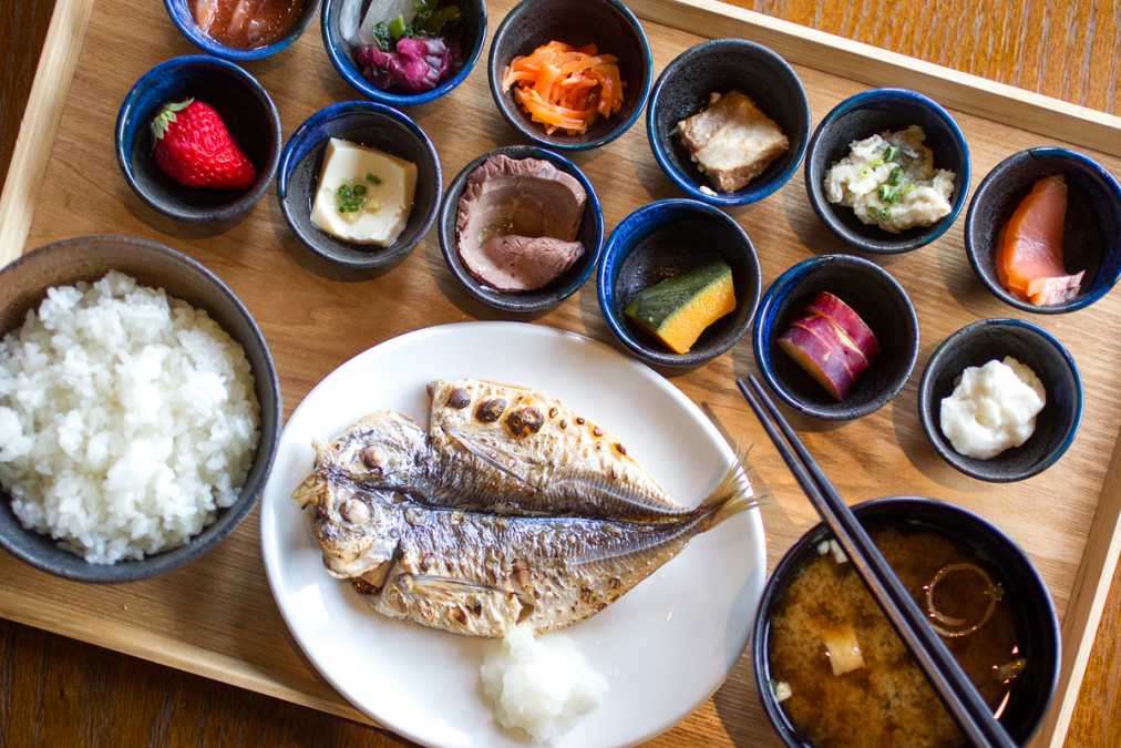 カフェでは食事もいただけます。こちらは湯河原おちょこ御膳(1860円)。湯河原名産の干物をメインに、おちょこに入った12種のおばんざいがずらり。「いろんなものを少しずつ食べたい」という乙女心をわかってる!
