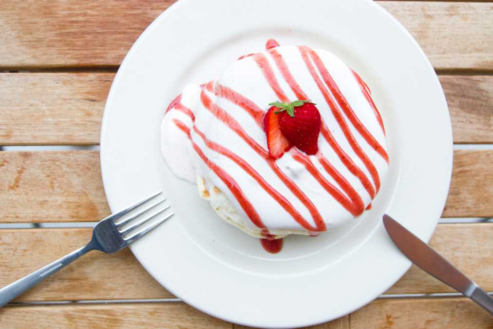 こちらはイチゴマスカルポーネパンケーキ(1296円)。メレンゲをきめ細かく泡立て、ふわふわに焼き上げたバターミルクパンケーキで、マスカルポーネチーズ&自家製イチゴソースがかかっています。直径約15cm、厚さ約2cmの2枚重ねで、ボリューミーに見えますが、食感が軽くてペロリと完食できちゃいます。