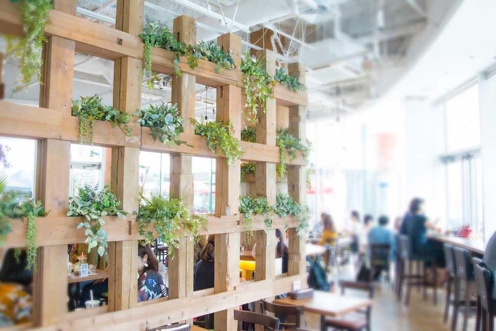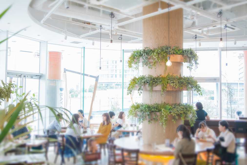 横浜ベイクォーターの3階。店内には60席があり、大きな窓から外光が差し込んで、明るく開放的。グリーンが効果的にレイアウトされています。