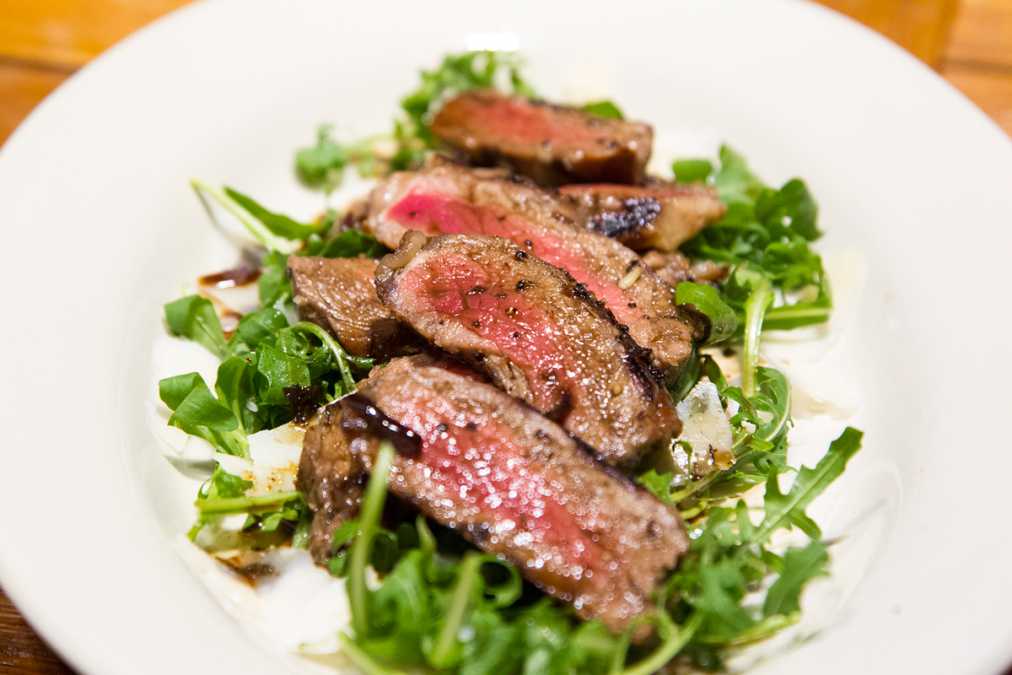 フードメニューも充実しています。こちらはスライスステーキバルサミコソース(1814円)。レアに焼き上げたサーロイン180gに、酸味と甘みのあるバルサミコソースをかけ、ルッコラやパルメザンチーズとともに味わいます。