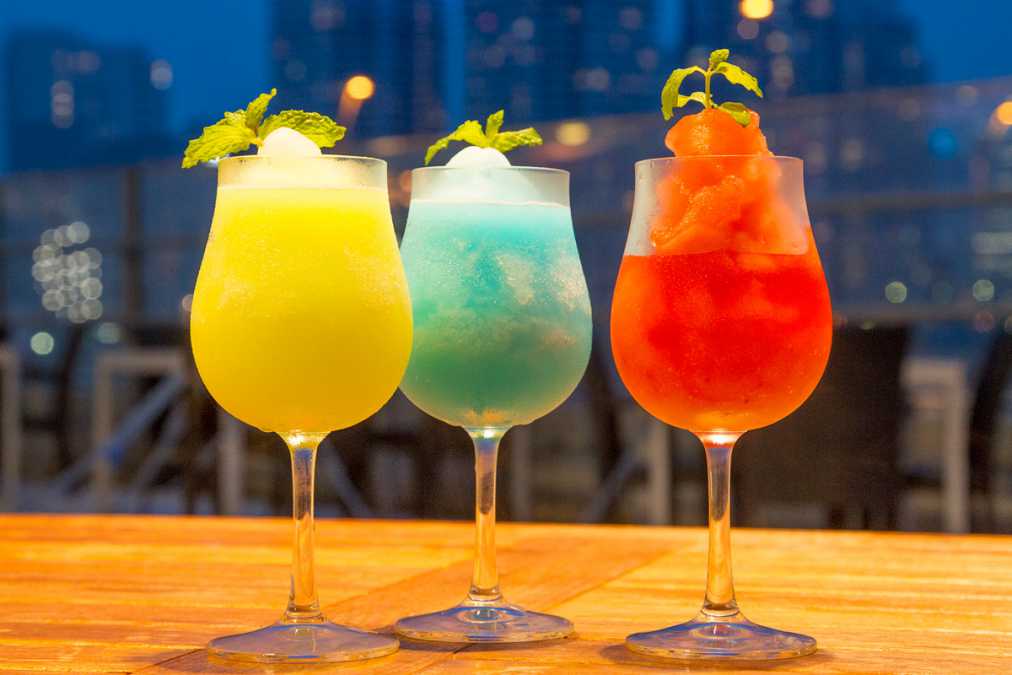 アルコールメニューを提供しているのが他のアース カフェにはない特徴。写真のフローズンカクテルは、左からヴェルデ(メロンリキュール+カルピス)、アズール(ブルーキュラソー+カルピス)、フレッサ(ストロベリーダイキリ)で各918円。テラスで夜景を眺めながら乾杯なんて最高です。