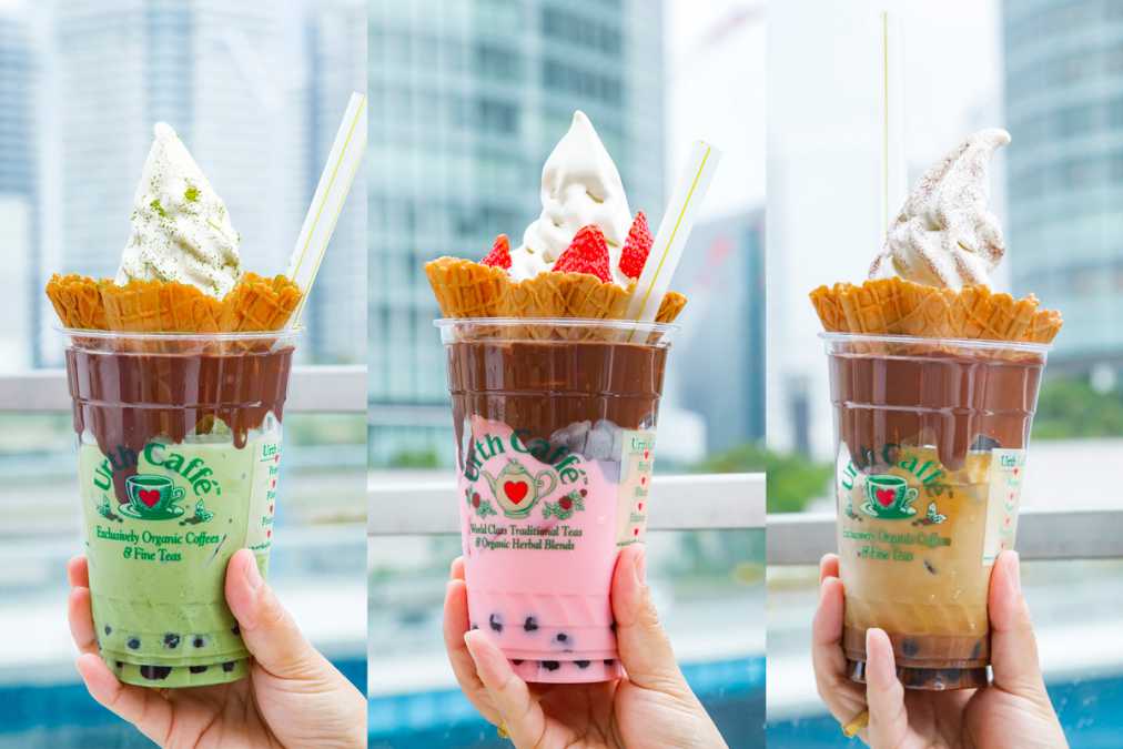 人気のボバシリーズに、6月からボバッフルクリーム(各1380円)がお目見え。写真左からオーガニックグリーンティ、ストロベリー、コーヒーの3種。ボバドリンクの上にワッフルコーンと北海道ソフトクリームがのっています。そのまま飲んで、濃厚なソフトを味わった後は、コーンを崩してドリンクに浸しながら召し上がれ。
