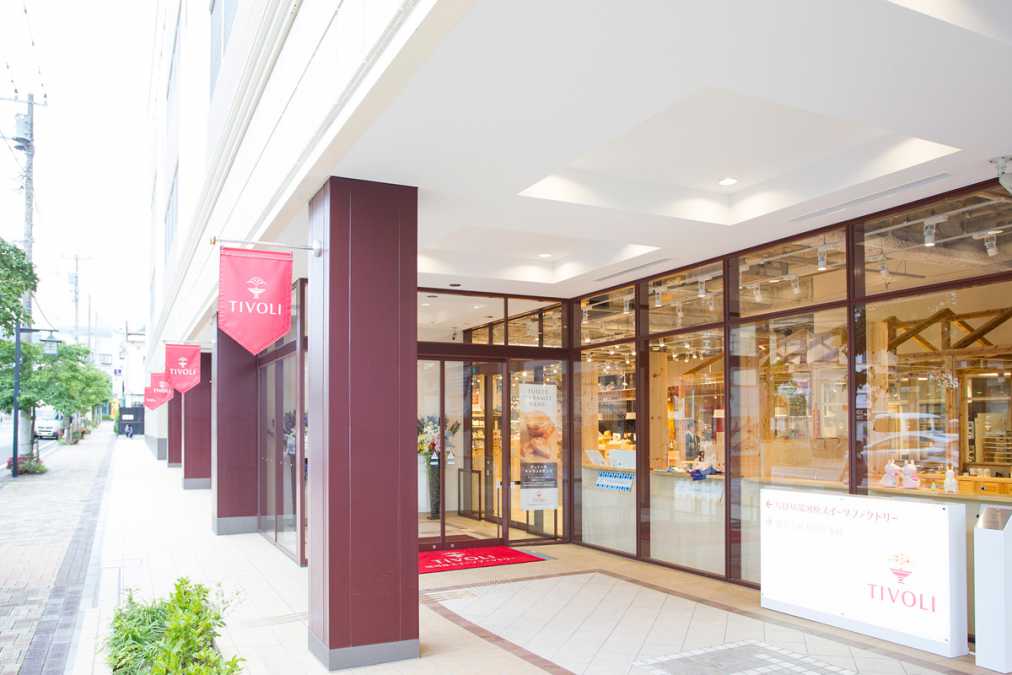 JR湯河原駅から徒歩3分の場所に、2017年にリニューアルされた本社工場があります。1階はカフェやショップ、お菓子作り体験コーナー、2階に工場の製造ラインがあり、付近には甘い香りがふんわり。