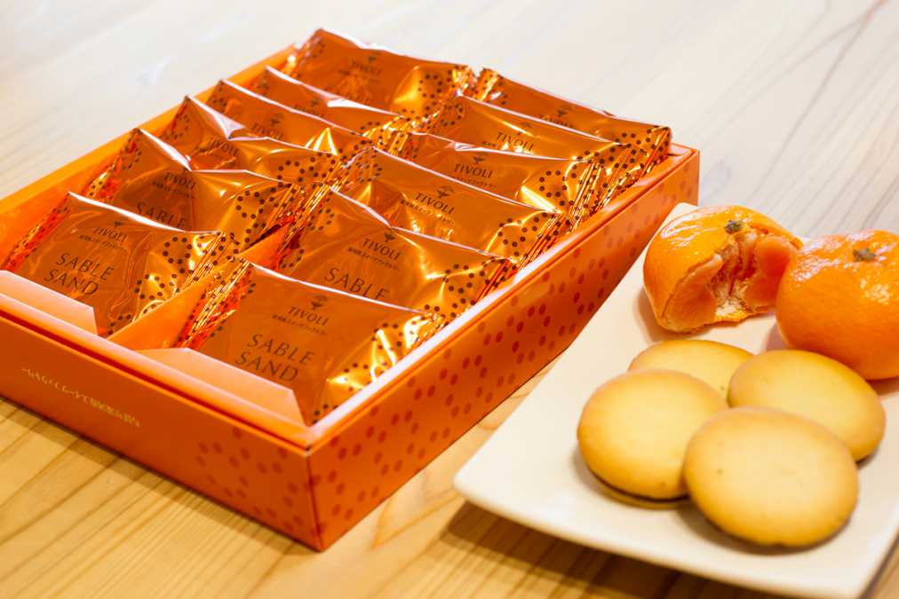おみやげならサブレサンドみかんジャム(12枚入り1620円)を。さっくりとした生地で湯河原みかんジャムを挟んだサンドクッキーで、みかんの酸味とキャラメルの甘さが見事にマッチ。バラ売りは1枚135円で、箱入りで4枚・8枚・12枚・16枚があります。