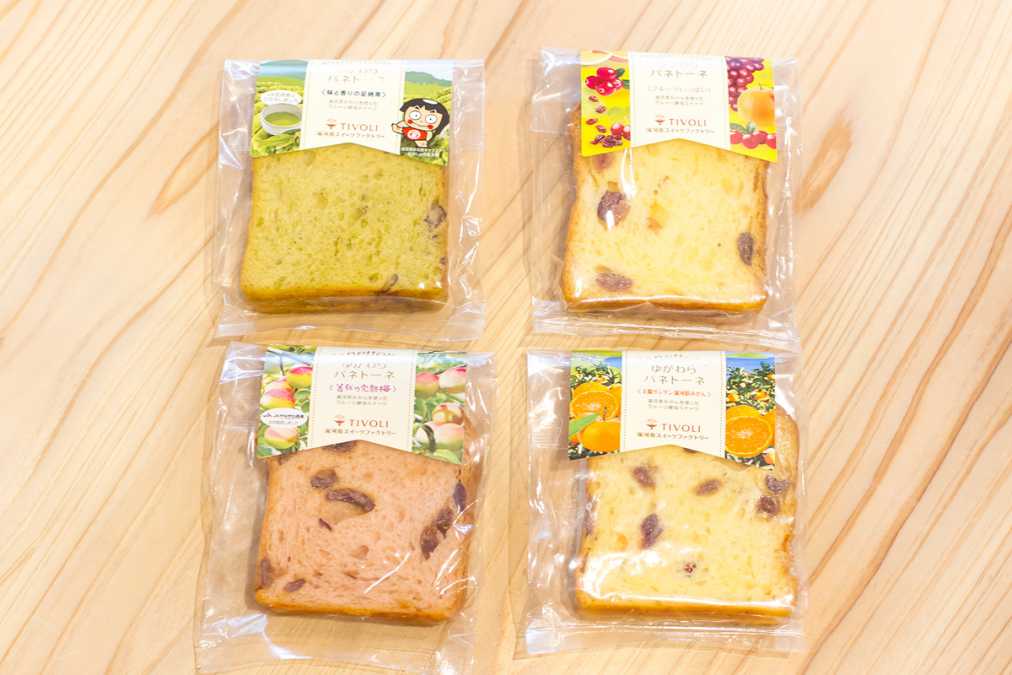 こちらは小田原産の柑橘類である湘南ゴールドの酵母種を使った菓子パン、湯河原パネトーネ(1個162円)。湯河原みかん、足柄茶、フルーツ、曽我の完熟梅の4種あります。