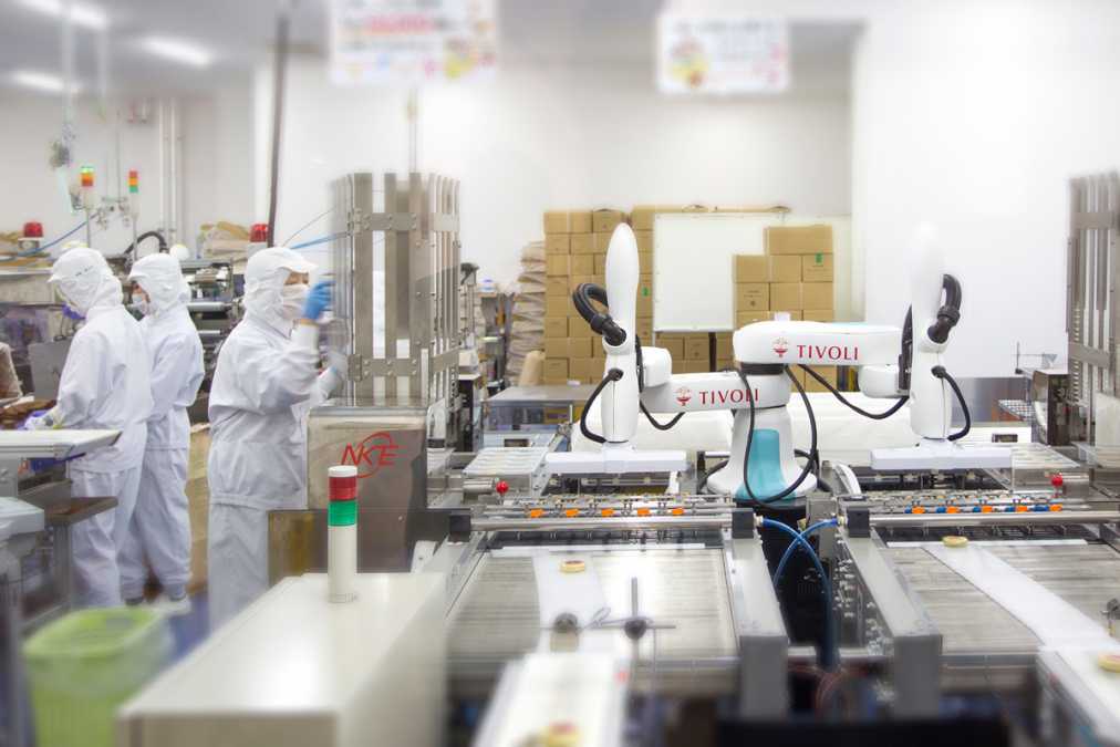 2階にあるのは予約不要&無料で見られるミニ工場見学コース。ベルトコンベアにのってクッキーが流れてくる様子や、精巧な動きで商品を持ち上げるロボットアームなど、ガラス窓越しに自由に見学できます。ほかにも、服についた埃や髪の毛を吹き飛ばすエアシャワー体験、豆知識の展示パネルなど大充実。