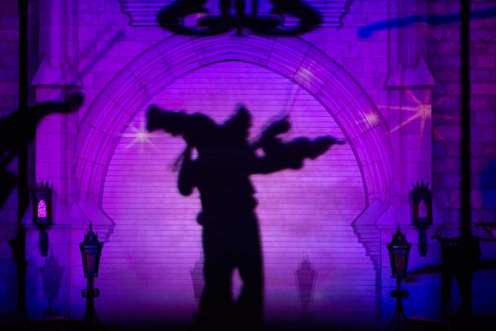 ミッキーの登場前にはグーフィーの姿も!こちらはシルエットのみ。オーケストラの準備シーンにあわせたグーフィーの登場は、アトラクション「ミッキーのフィルハーマジック」を思い出させます。