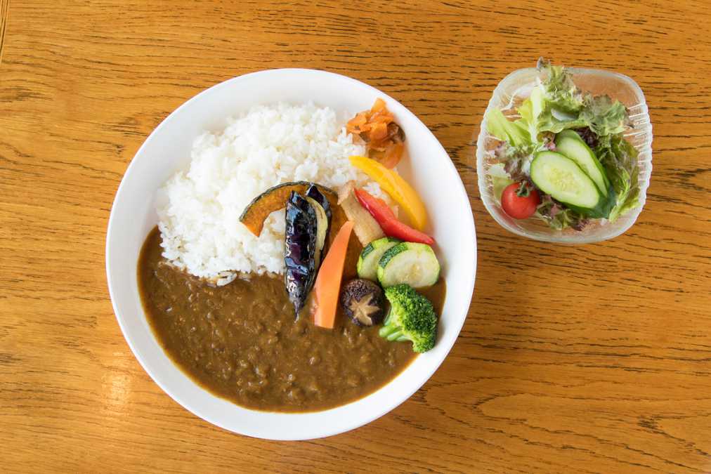 洞窟めぐりでそろそろお腹が空くころ。約800mの山上にあるスカイパレスときわで、ランチタイムです。お目当ては、地元で採れた旬の野菜がたっぷりのった、たむら八彩カレー(750円)。高原育ちの濃厚な野菜を、コク深い自家製ルーが受け止めます。