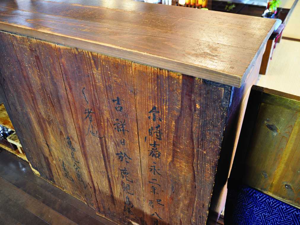 例えばキッチンと客席を分けるカウンターは、元々この家にあったという古箪笥を再利用。なんと嘉永2年(1849)の文字が書かれています。160年超モノです。