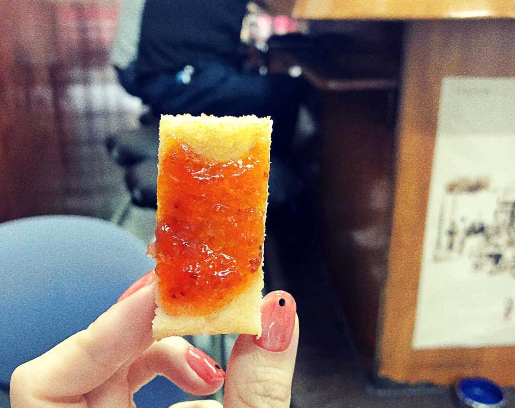 こちらのカスタマイズは、「耳あり8つ切りのハーフ」。ツウはバターとジャムが半々になっていることをハーフと呼ぶそうです。