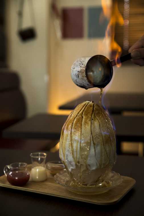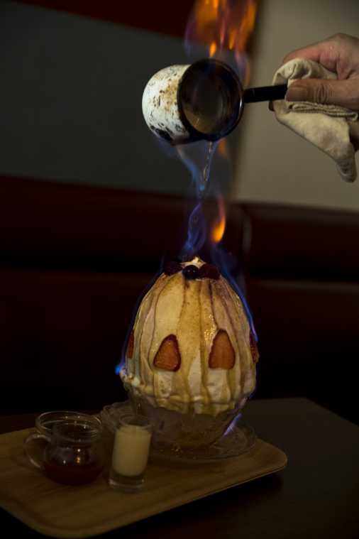 ここからが本番です。テーブルにかき氷が到着すると、スタッフの方が火の付いたラム酒を上からかけていきます。火の付いたラム酒はみるみるうちにかき氷全体を炎で覆っていき、燃えるかき氷の完成! 目の前で感じるラムの香りと炎の熱さは、かなりのインパクトです。
