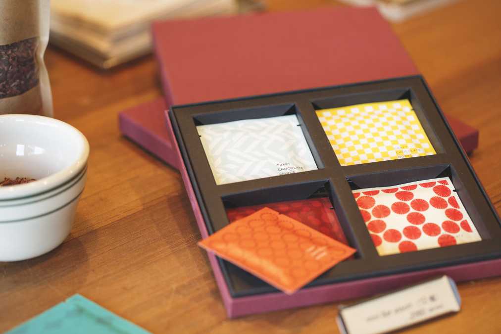 味だけでなくもう一つの魅力はパッケージです。ショップに並べられたチョコレートは、JAPAN MADEを想わせる和柄モチーフのカラフルなデザインは、ひと味違うオトナの贈り物に喜ばれそう。お好きなコーヒーやお酒とのペアリングを楽しめます。
