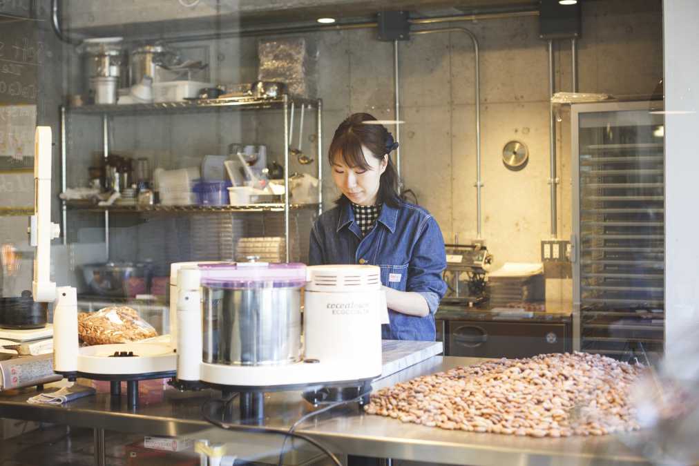 カウンターのすぐ後ろには工房があります。カカオ豆の産地による違いを楽しんでほしい、そんな思いが込められているので、原材料はシンプルにカカオ豆とオーガニックシュガーとカカオバターのみ。豆の個性を最大限に引き出すため、焙煎方法は少しずつ変えています。また、味の違いを比べやすいように、カカオ70%に揃えているんだそう。(一種類のみ85%)