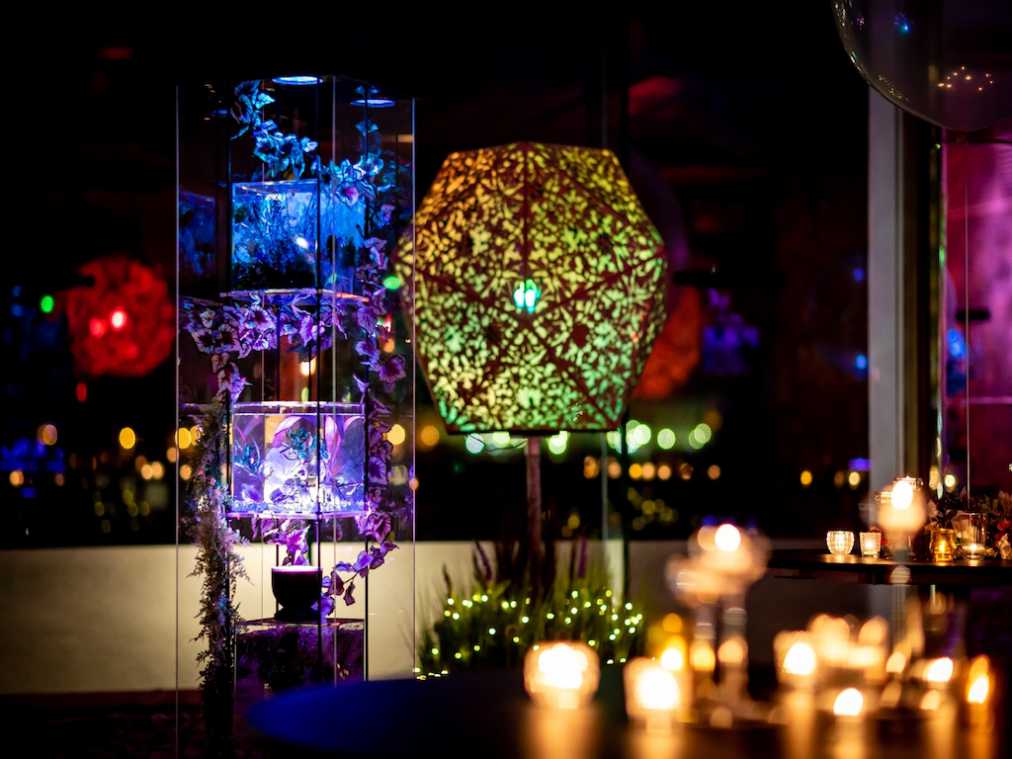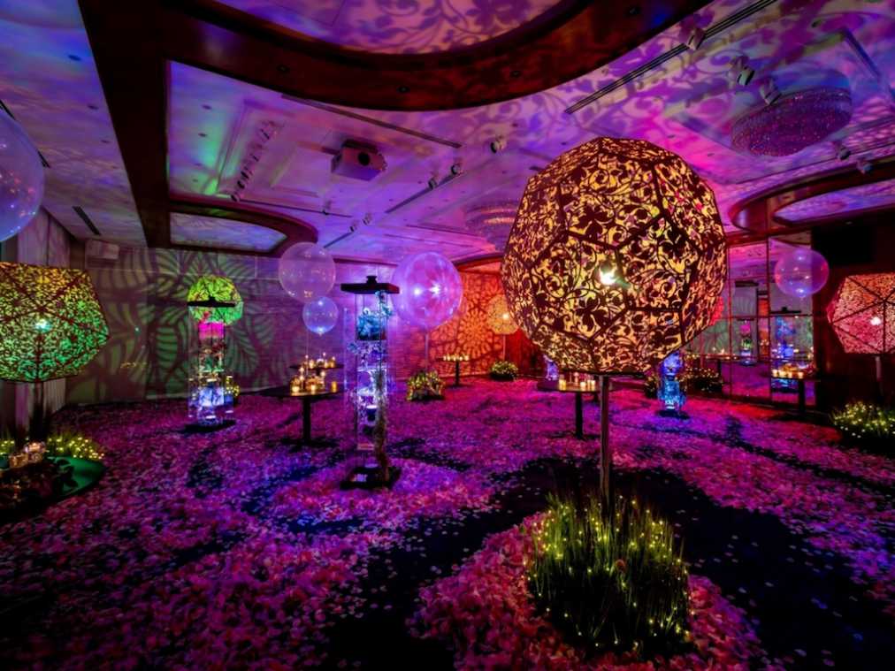 館内は、披露宴会場ならではの天井の高さや広さを活かした装飾により“幻想的な光のアート空間”に。ランプシェードから放たれる幾何学模様のカラフルな光と影が、まるで万華鏡のような世界を造り上げ、さらに7カ所に設置された大型の「ハーバリウム」が空間に華を添えます。