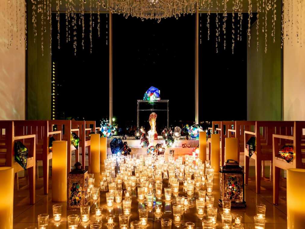 別会場のチャペルには、大小異なるさまざまな形をした約50個のステンドグラスと、約300本のキャンドルがやさしく輝き、灯ります。