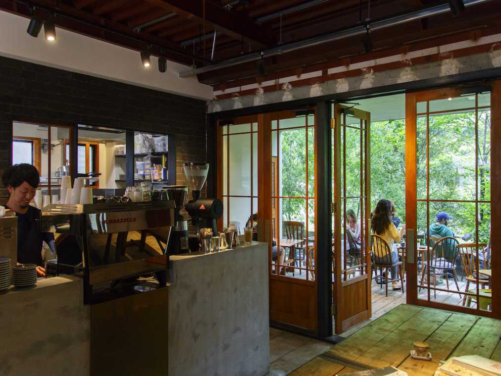 この眺望の秘密は、カフェが「伏見稲荷大社」の境内に隣接して立っているから。目に入る木々は、すべて神聖な鎮守の森なんです。その先には池もあり、ゴイサギやカワセミなどの珍しい野鳥も飛来します。
