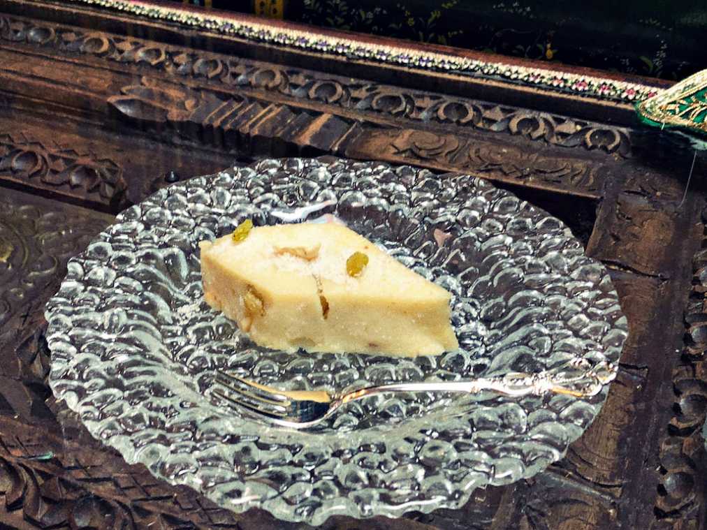 紅茶のお供におすすめなのは、インド最古のお菓子と言われる「ハルワ」(520円)。お祝いなどの席でいただくめでたいスイーツなのだそう。パスタに使われるセモリナ粉で作られており、温かい状態でいただきます。フォークを入れるとモチっとした弾力感があり、ひと口食べるとクリーミーな味が広がります。