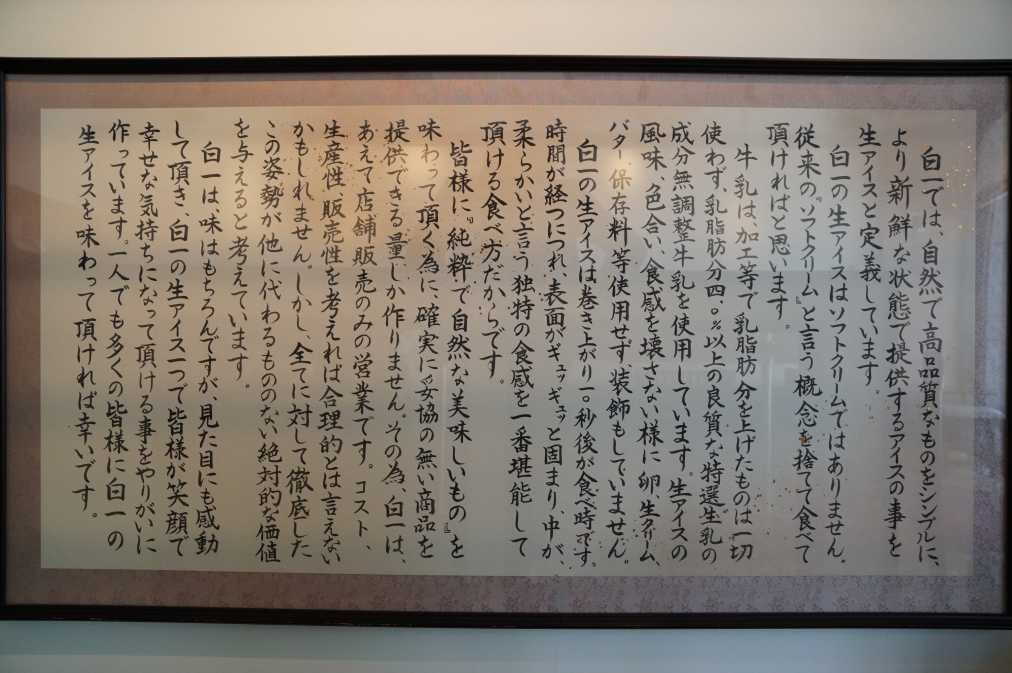 店内の壁には、立派な文字で「牛乳生アイス」の定義が書いてありました。曰く、「白一の生アイスはソフトクリームではありません」。