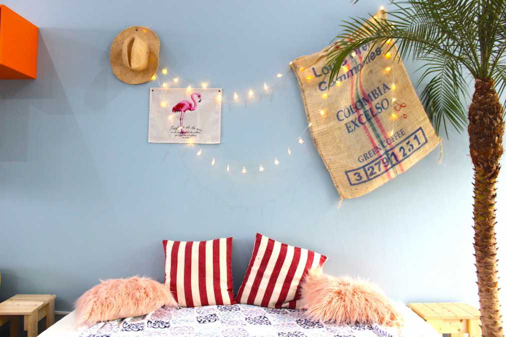 店内の壁は薄いブルーで、どこを背景にしても写真映えばっちり。白い羽根があしらわれたスペースの前に立てば、まるで天使になったような写真が撮れます。