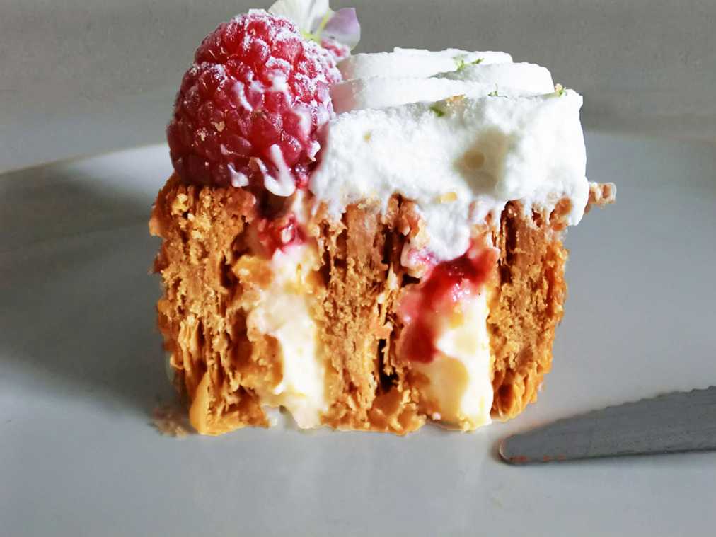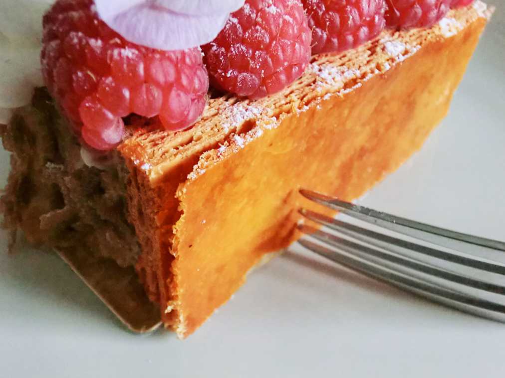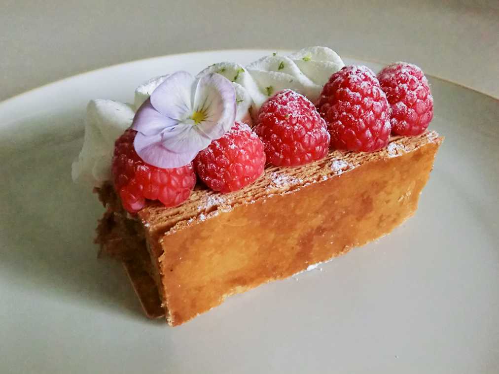 ザクザクッと厚みのある音をさせてナイフを入れ、いざ実食!軽い塩気を感じるパイ生地はバターのコクと風味がしっかりたっていて、カスタードとバターを混ぜた濃厚なクリームと相性抜群。クリームに忍ばせた洋酒とラズベリージャムも絶妙なアクセントになっています。力強いけれどモダンなおいしさにパリを感じました!