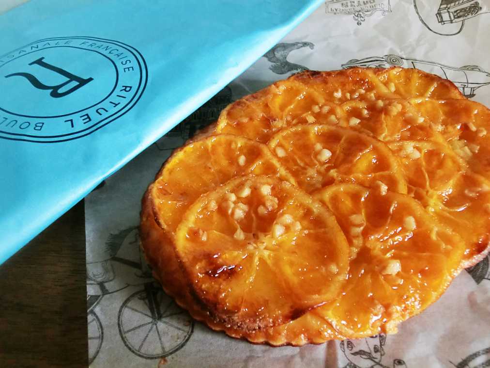 ミルフィーユのあとに食べ比べてほしいのがミルフィーユと同じパイ生地を使った、こちらのタルト。生地を8mmの極薄にのばし、アーモンドクリームとともに愛知の蒲郡みかんをのせ、表面をカラメリゼした「タルト ア ラ マンダリン」(590円)です。季節によってきのこ、さつまいも、りんごなど具が変わるそう。