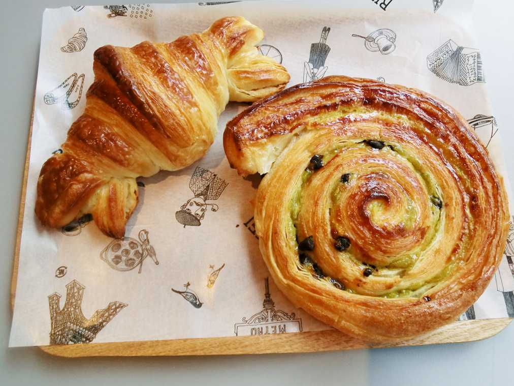看板商品は写真左から「クロワッサン」(250円)とクロワッサン生地でピスタチオクリームを巻いた「エスカルゴ ショコラ・ピスタージュ」(390円)。毎日通いたくなる店を目指して努力を重ね、1号店がオープンした当時より商品ラインナップを大幅に拡大中です。