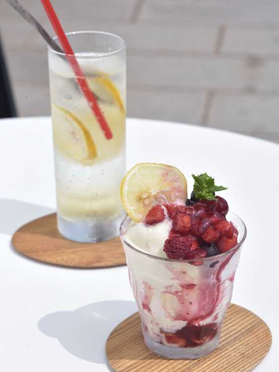 瀬戸内産のレモンを使用したドリンクも人気。暑い日にはレモンスカッシュ648円でサッパリと。レモン系のドリンクには、濃厚な味わいのパフェがぴったり。写真のクリームチーズパフェ864円をはじめ、抹茶&白玉、キャラメルチョコの3種から選べます。